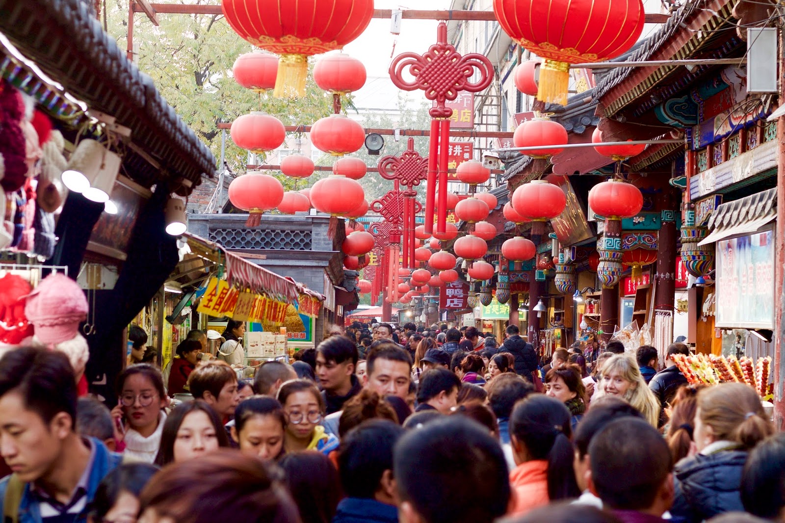 Na transversal da Avenida de Wangfujing fica o mercado nocturno de comidas. Os preços são muito altos, pois é um mercado para turistas, mas vale a pena lá passar para ver a enorme quantidade de pessoas que lá anda e provar um ou outro petisco.