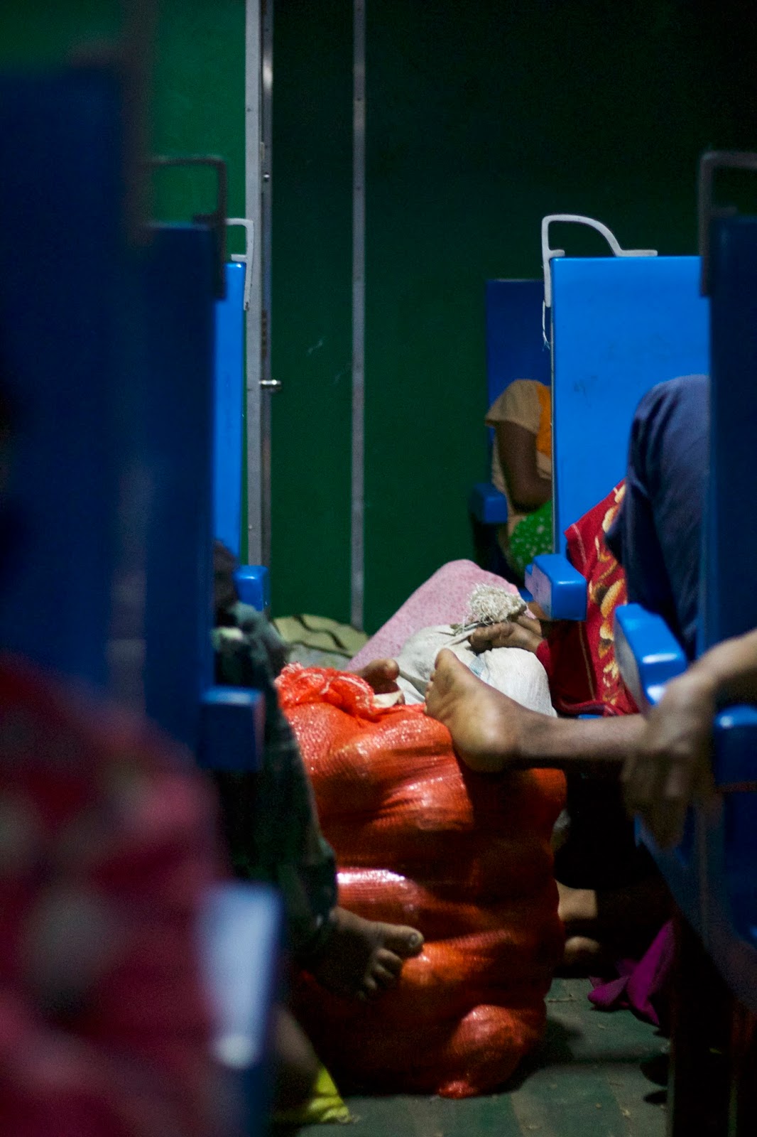 Este segundo comboio tinha tudo para ser um comboio normal: lugares "normais", individuais, com ventoínhas e iluminação. Digo tinha porque apesar de tudo, esta viagem foi tudo menos normal e talvez ainda mais desconfortável do que a primeira parte: as ventoínhas não funcionavam e como tal todas as janelas iam abertas para tentar atenuar o atroz calor húmido, matamos algumas carraças na parede do comboio mesmo ao nosso lado e quando anoiteceu, bem... aí foi o fim do mundo da bicharada atraída pelas luzes interiores do comboio. Como se tudo isto não bastasse, um dos muitos vendedores ambulantes que entravam e saíam do comboio para fazer negócio, decidiu apanhar uma valente bebedeira a bordo e decidiu dormir no espaço das malas mesmo por cima dos nossos lugares.