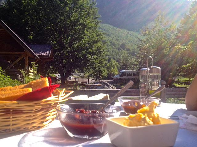 Após muita ponderação optamos por um dos alojamentos dos donos do Journey To Valbona, um site com muita informação útil acerca do vale, esperando que tal constituísse uma vantagem aquando da nossa estadia no que concerne à obtenção de informação útil para caminhadas, trilhos, etc. Não podíamos estar mais enganados, uma vez que mesmo quando pedimos informações pouco ou nada nos foi adiantado para além do que se encontra no site. Valeu pelo pequeno-almoço tradicional e confeccionado localmente (manteiga e feta caseiros, doce de physalis e pão tradicional) e pelo cordeiro assado no forno com algumas partes "nobres" do mesmo reservadas para o final do prato!