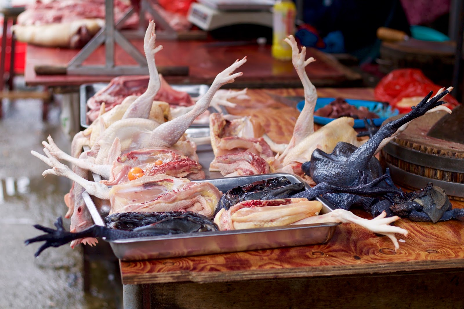 Depois surge a secção das carnes, que sinceramente só visitamos de forma "aprofundada" na nossa segunda visita, aquando de uma aula de culinária. Começando pelos animais mais vulgares, em que galinhas mortas são geralmente expostas por cima das que ainda respiram, chegamos a uma zona onde é possível encontrar de tudo: coelhos, sapos, patos, gansos, pombos, marmotas, gatos e cães. Convém ter em conta que os animais geralmente são mortos na hora e não raras vezes em frente aos clientes, pelo que é aconselhável alguma prudência aos mais sensíveis.