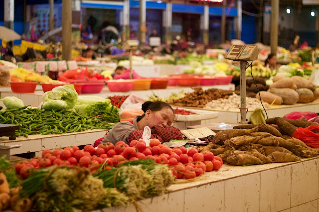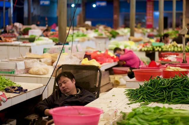 O mercado começa ainda na rua, com vários vendedores de vegetais e frutas nos passeios. Depois entra-se no mercado propriamente dito e a primeira secção é ainda de vegetais e frutas, com alguns vendedores de comida já confeccionada e muita gente com sono!